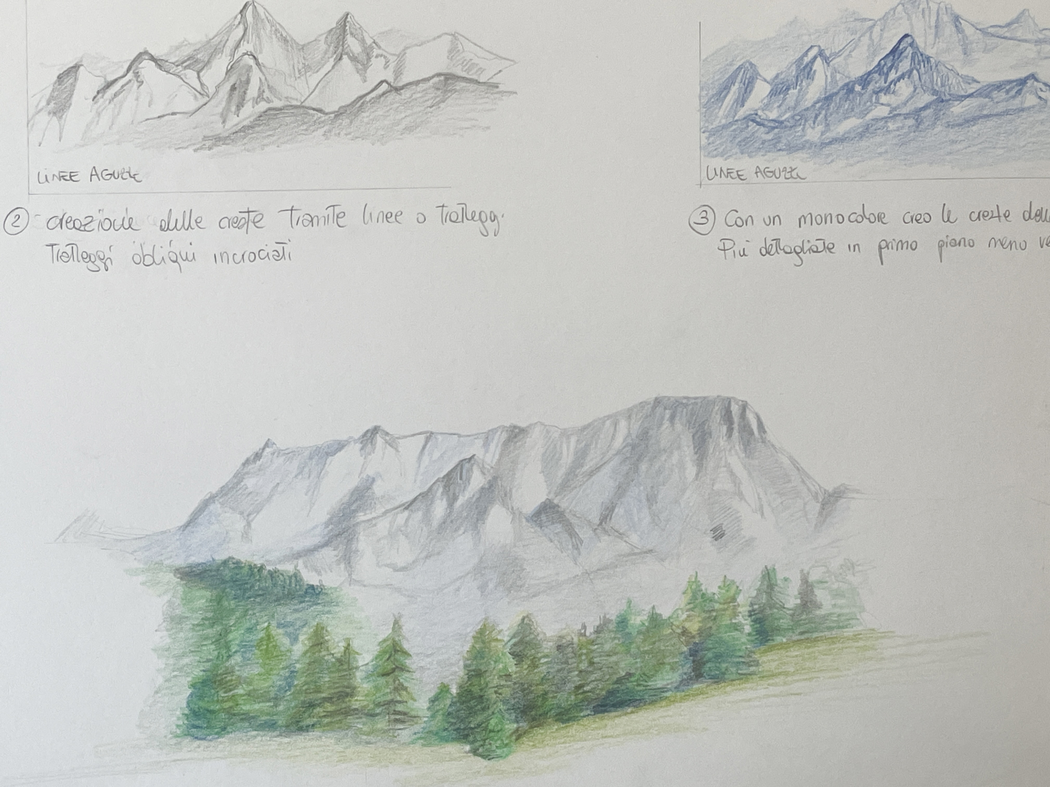 Da riferimenti fotografici riprodurremo paesaggi montani, riproducendo del dettaglio elementi della natura, foglie, fiori, cime montane, acqua e prati. Da questi elementi, studiandoli nei dettagli realizzeremo dei paesaggi completi.