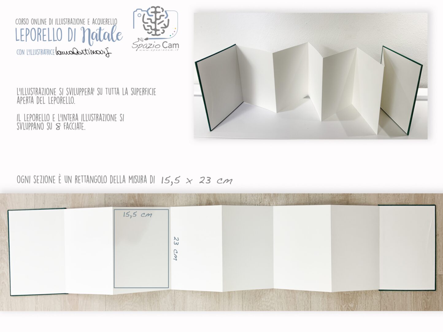 L’insegnante lavorerà su un leporello con le facciate (8) da 15,5 cm x 23 cm, ma è possibile usare formati diversi. L’importante è che sia una misura in scala, così da poter riportare correttamente il disegno che verrà inviato via mail prima dell’inizio del corso.